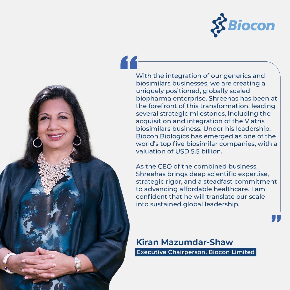 Biocon’s Biosimilars business is consolidated under an independent entity – Biocon Biologics Limited – with its dedicated management.